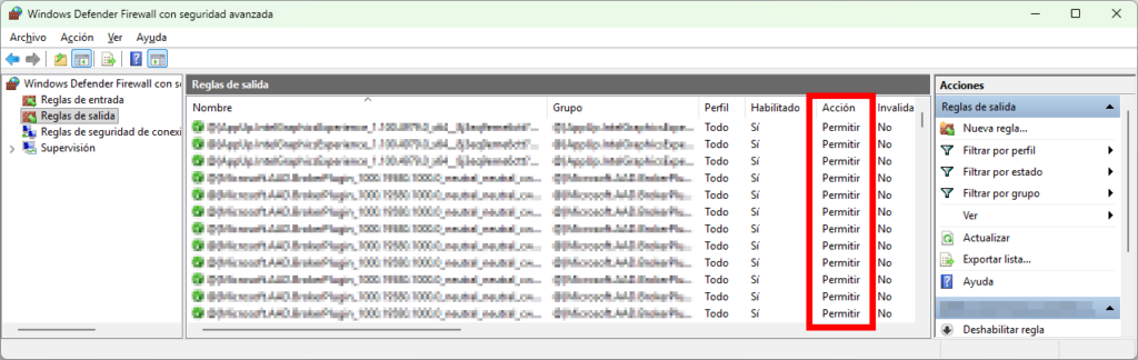 - Ve a Reglas de salida y ordena por Action para identificar bloqueos.