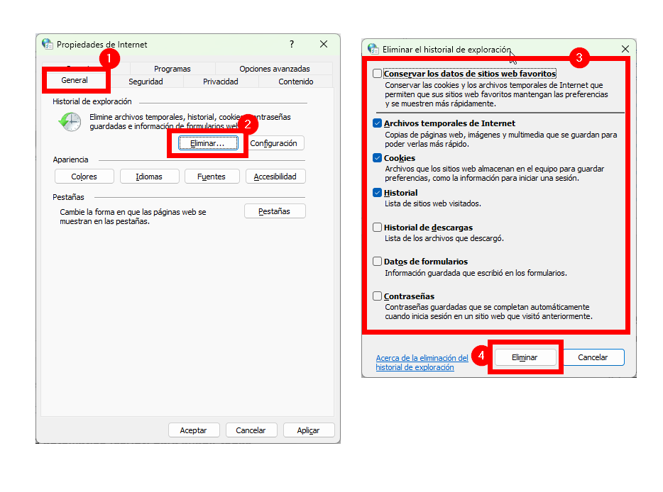 - Abre Opciones de internet > General > Eliminar….