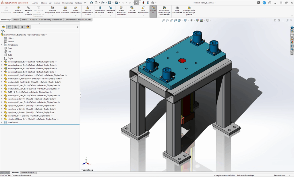 Como indicamos, este recurso está disponible en todo tipo de licencias, desde Standard a Premium, tanto si son de escritorio como si son de 3DEXPERIENCE. El primer paso para hacer animaciones con SOLIDWORKS es abrir el ensamblaje del que quieras realizar la animación. En este ejemplo utilizaremos uno sencillo: