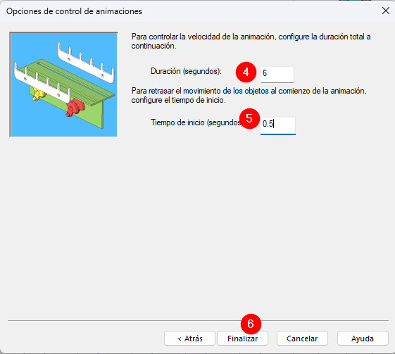 3. Establece la duración y el tiempo de inicio (ambas en segundos) de la animación y clica en Finalizar: