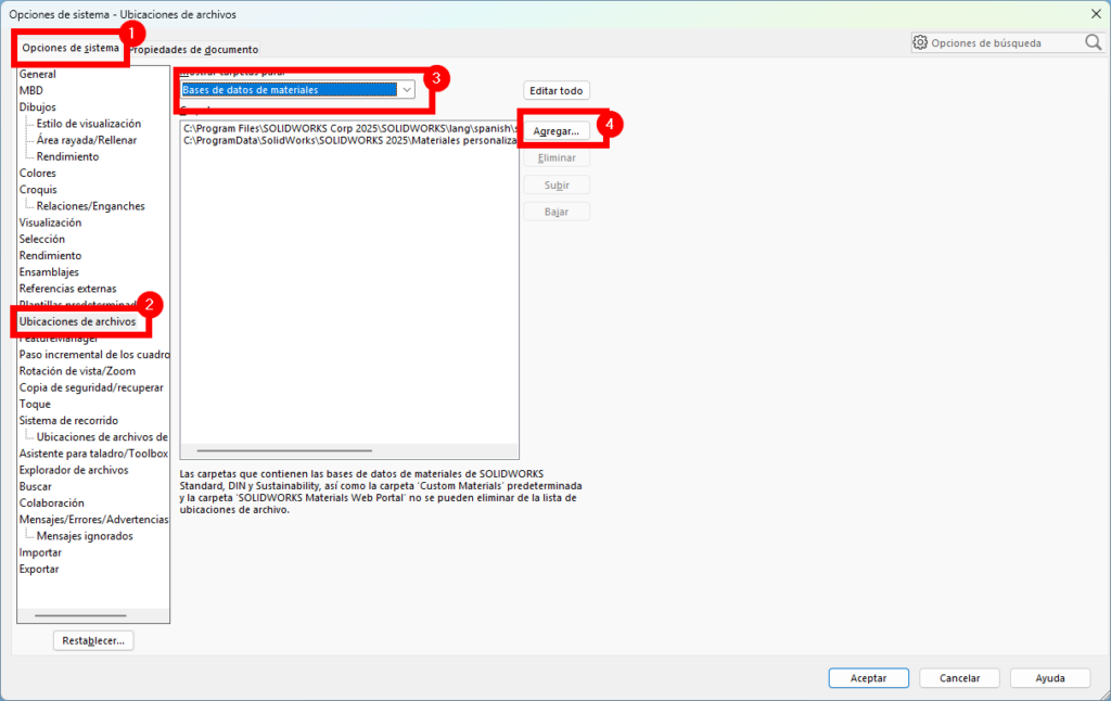 Herramientas > Opciones > Opciones del sistema > Ubicaciones de archivos - Selecciona: Bases de datos de materiales