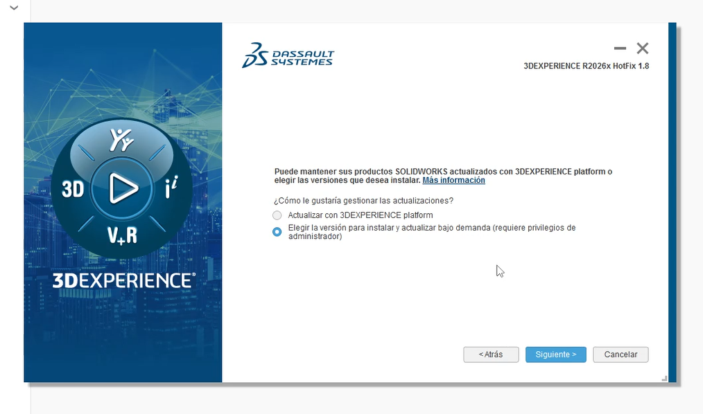 Nota: La opción para gestionar tus actualizaciones solo se muestra en nuevas instalaciones y no durante actualizaciones. Si ya has instalado SOLIDWORKS Design R2026x GA, debes desinstalar tus aplicaciones y volver a instalarlas para acceder a la nueva opción.