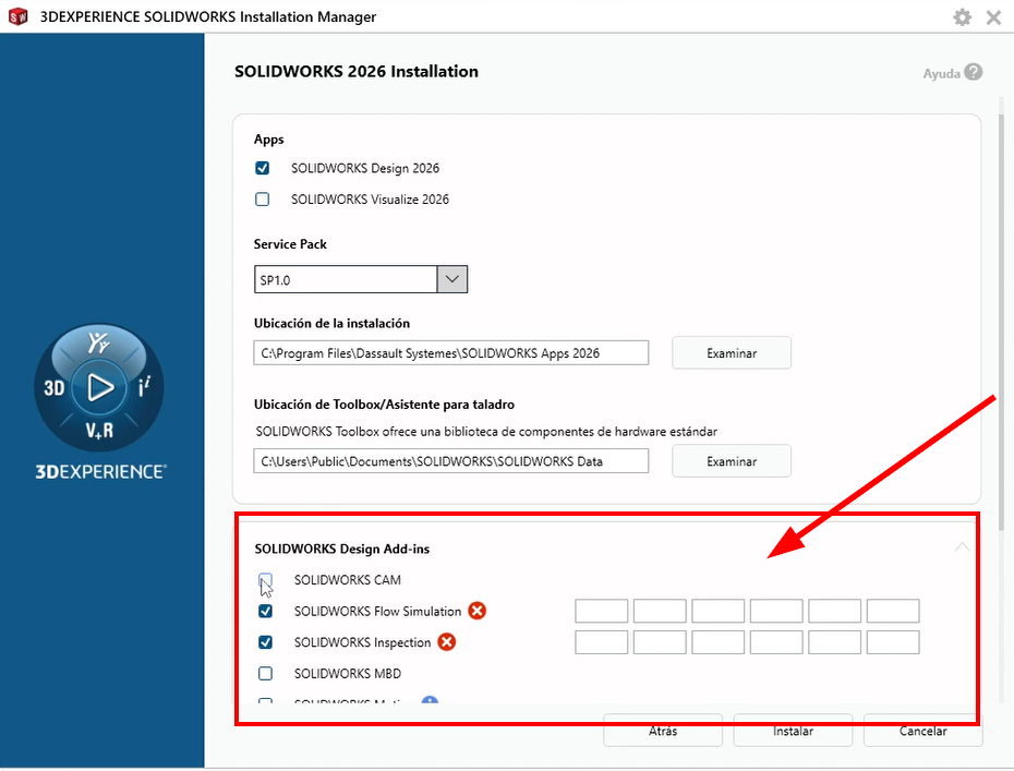 Como veis, podemos elegir que app queremos instalar y su service pack. Asimismo, si clicamos en SOLIDWORKS Design Add-ins se abrirá un submenú el que podremos activar los complementos que tengamos contratados: