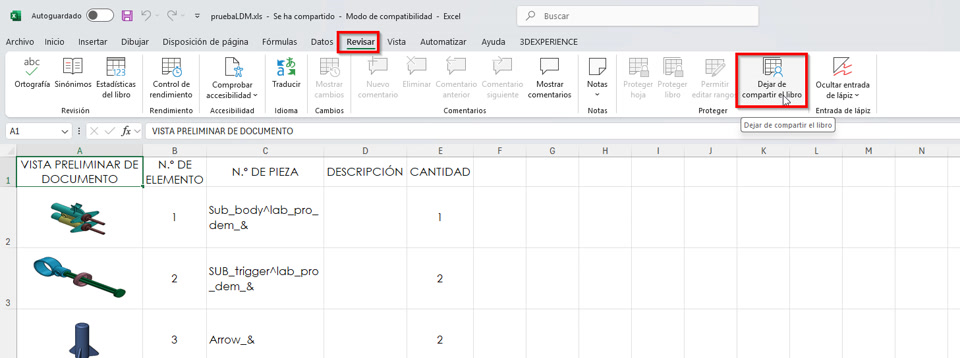 Al abrir el archivo en Excel, observarás que las acciones son limitadas: no podrás combinar celdas, manipular las imágenes, insertar nuevas imágenes… Esto se debe a que, aunque no exista un vínculo entre la lista de materiales generada en Excel y el modelo de SOLIDWORKS, la creación de la tabla se realiza con un estilo predefinido: bordes, cabeceras y filas bloqueadas en estructura de tabla.